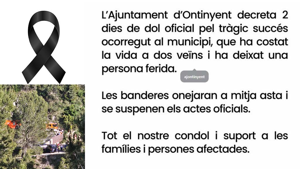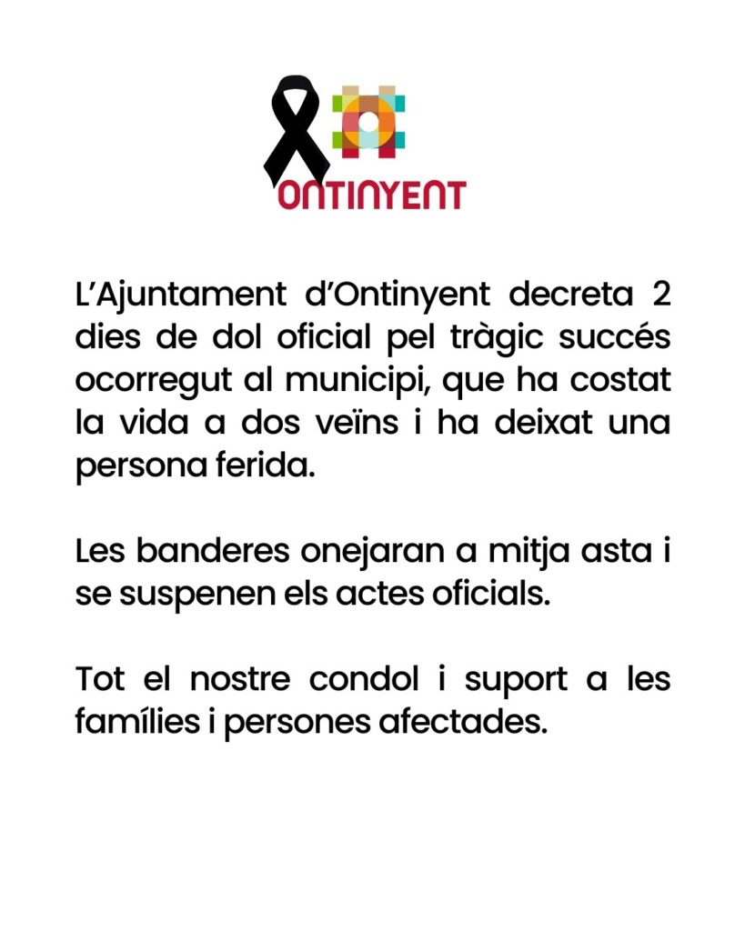 L’Ajuntament d’Ontinyent ha decretat dos dies de dol oficial arran del tràgic accident de trànsit ocorregut este diumenge al municipi, que ha costat la vida a dos persones de la localitat i ha deixat la ciutat profundament commocionada.